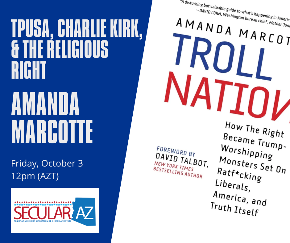 | | | |  | Political Reporter Amanda Marcotte Last week, author and Salon senior politics reporter Amanda Marcotte joined us to discuss her reporting on Charlie Kirk and Turning Point USA's growing alignment with religious extremists. Don't miss this fascinating conversation with a political insider on recent events. Watch on Secular AZ's YouTube channel |