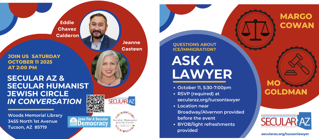 | |  | Hey Tucson! Secular AZ is heading your way on Saturday, October 11 for not one, but two in-person events... and you're invited to both. At 2pm, we're meeting at the Woods Memorial Library (3455 North 1st. Avenue) for a conversation with Secular AZ’s Jeanne Casteen and Eddie Chavez Calderon, hosted by the Secular Humanist Jewish Circle of Tucson. We’ll discuss Secular AZ’s work in education and church: state separation issues, as well as Eddie’s work in advocacy, human rights, and fundraising. Find details for this free event here. Then at 5:30pm, join us for Tucson-Ask-A-Lawyer. Two experts will join us to answer your questions about what's going on with immigration in Tucson and beyond. We'll meet near Broadway/Alvernon with special guests immigration activist Margo Cowan and immigration attorney Mo Goldman. RSVP is required. The location will be released the day before the event to registered guests. Light refreshments provided; please BYOB. Find details and registration here. See you in Tucson! |
